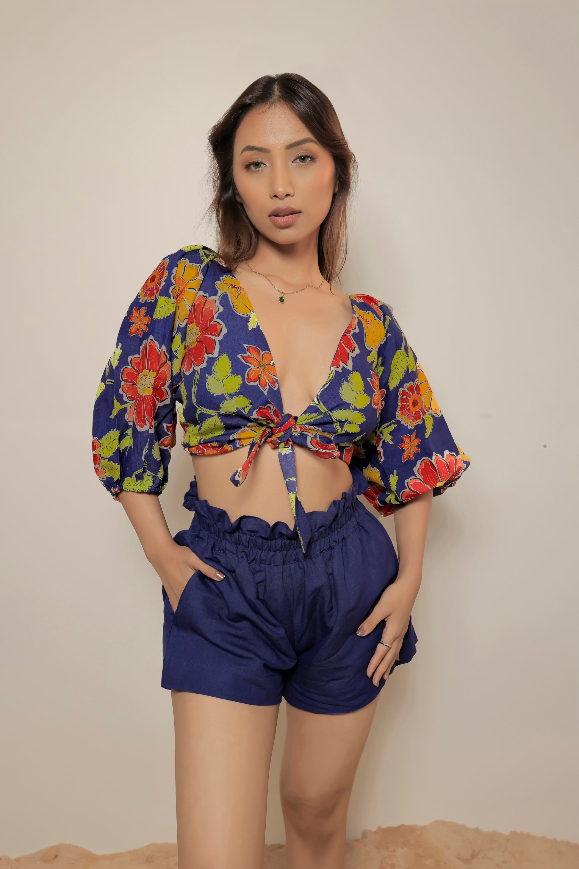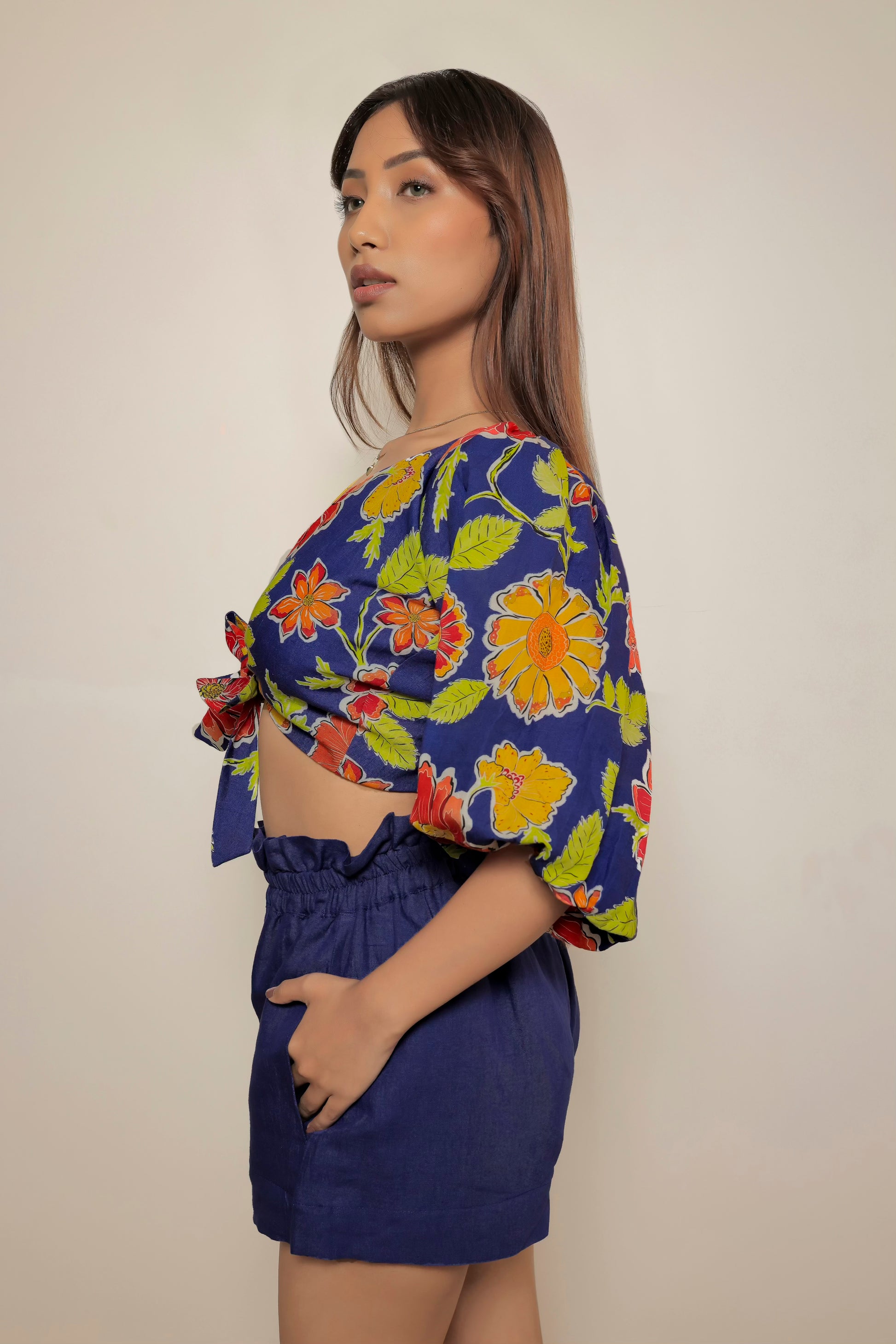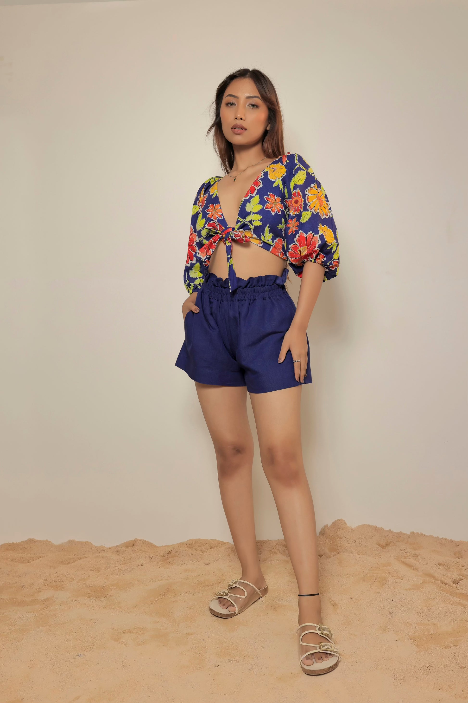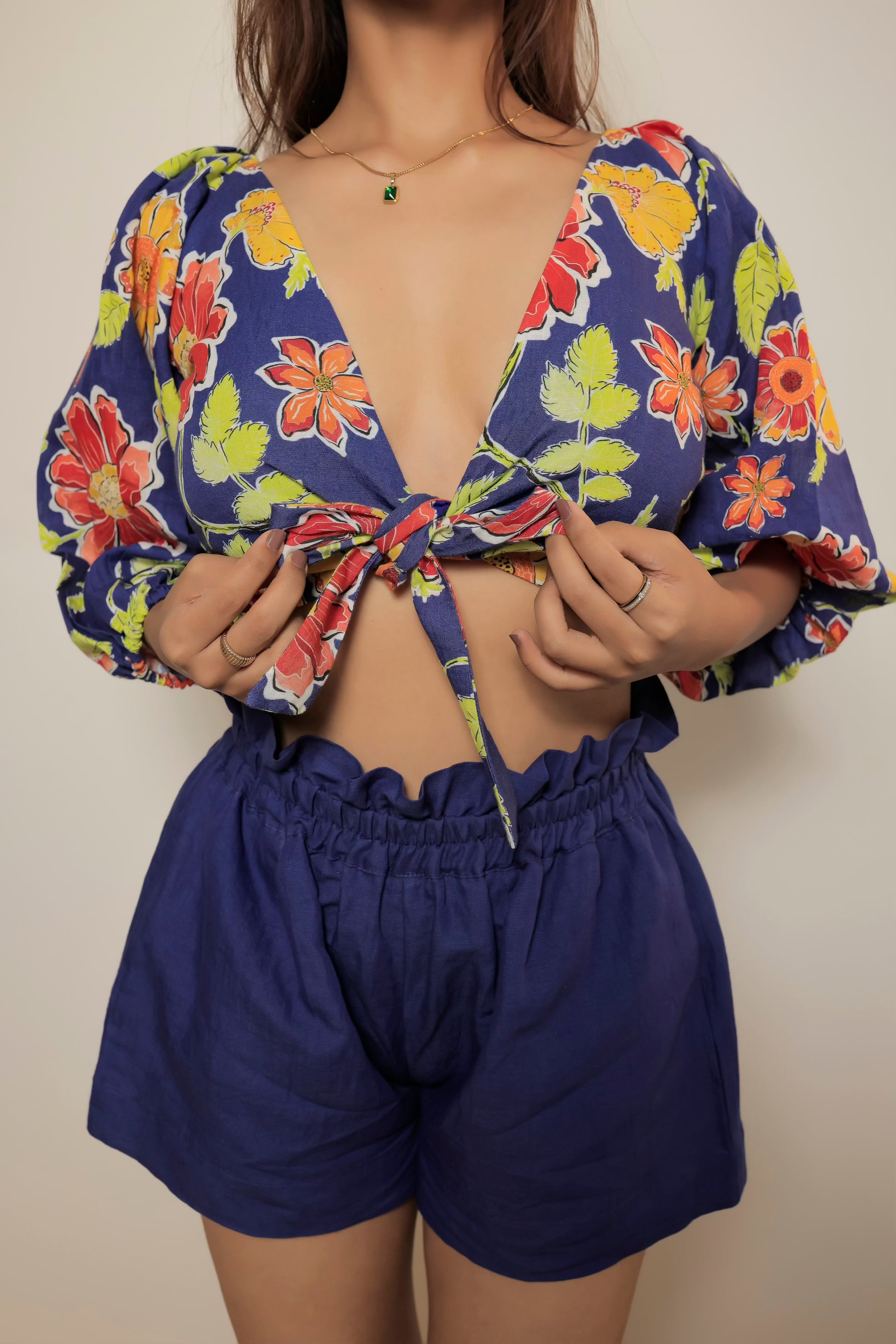 Bold, breezy, and made to stand out — the Cloud Knot coord set is your ultimate vacay vibe. Featuring soft blue linen shorts and a bright blue floral top with voluminous sleeves, this set is all about playful elegance. The front knot closure adds a fun twist, staying true to its name. Perfect for beach strolls, resort lounging, or sun-soaked getaways.