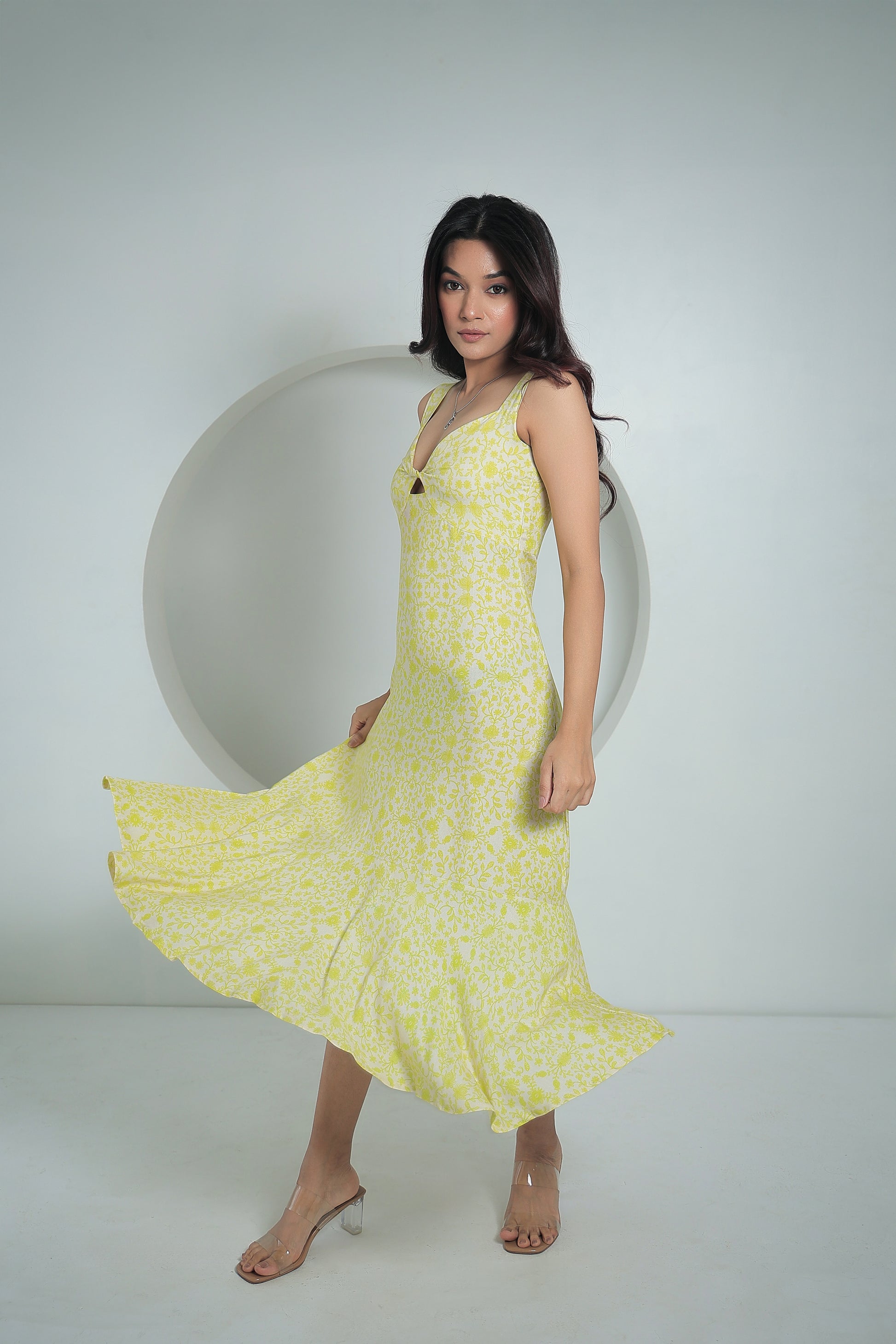 It is going to be your wardrobe favourite! With a wonderfully subtle yet refreshing folk floral print, this dress is a perfect choice for casual catch-ups. Its trendy-breezy design makes it ideal for a relaxing beach day or brunch with your gal-pals. The delicate lime print stands out while keeping your style fresh and comfy.