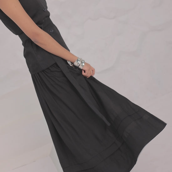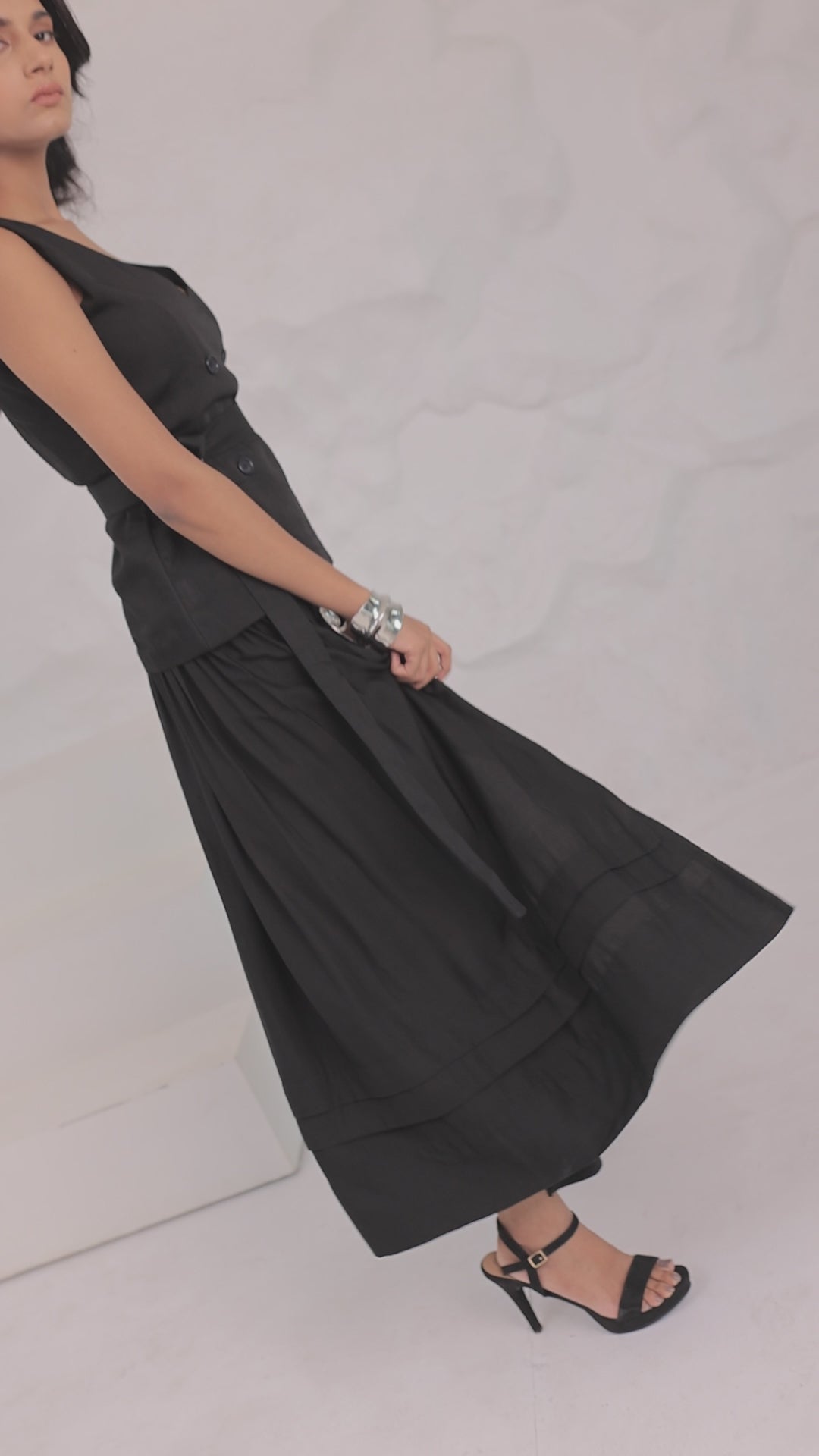 This waistcoat and skirt duo in soft cotton satin is a creature of supreme versatility. It has a chic, neat and tailored waistcoat which is smart, but still channels the coolness. The flowy skirt gives an unexpected twist of casual elegance. You can wear them to your business meetings during the daytime and pair them for evening formal occasions.